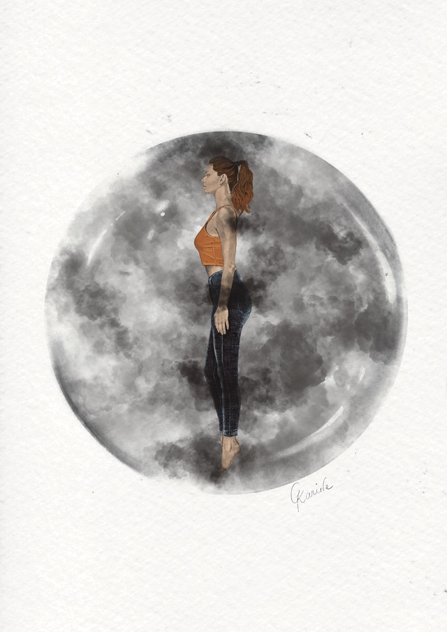 Cette illustration numérique représente une femme enfermée dans une bulle sombre, remplie de fumée. Cette oeuvre évoque un passage de vie, conséquent à un drame vécu, où cette femme se sent prisonnière d’une bulle de pollution (de m…). Il lui est alors impossible de voir une quelconque once de positivité dans son quotidien. Elle s’efforce d’en sortir mais elle n’en voit pas l’issue.