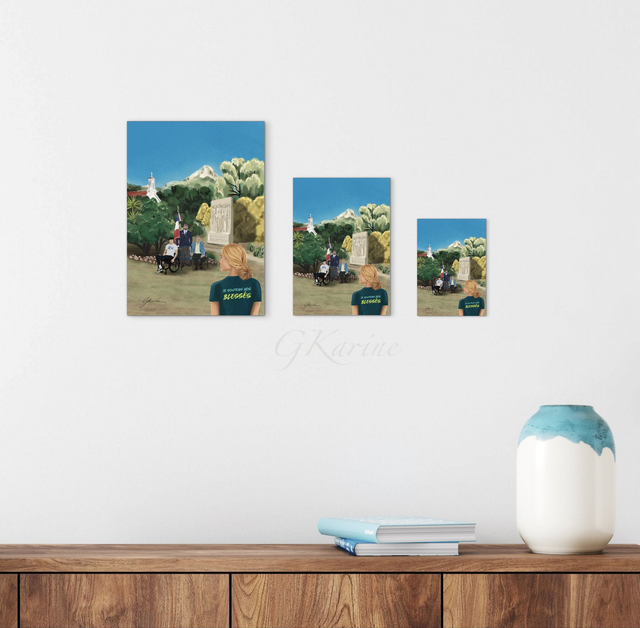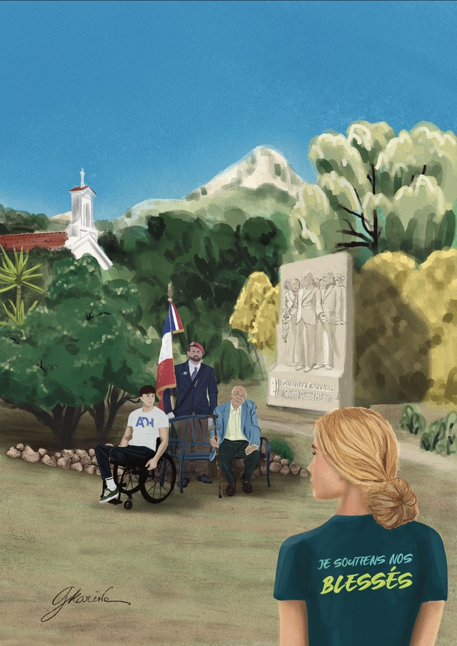 Découvrez cette illustration originale, un hommage poignant aux femmes qui accompagnent nos militaires blessés. Ces héroïnes du quotidien, souvent discrètes mais essentielles, y sont représentées avec émotion et respect. Inspirée par des lieux chargés d’histoire et soutenue par des associations comme Au-delà de nos handicaps et Les Gueules Cassées - UBFT, cette œuvre célèbre leur courage, leur amour et leur dévouement.