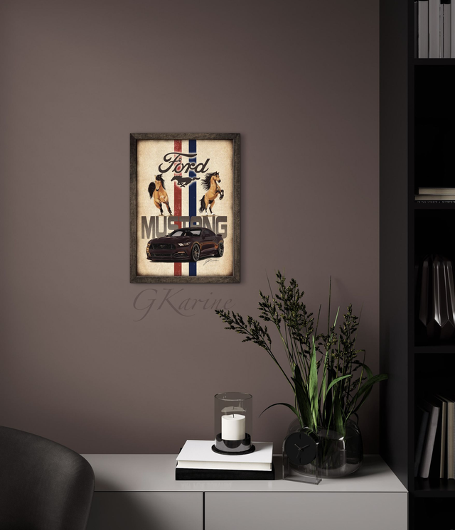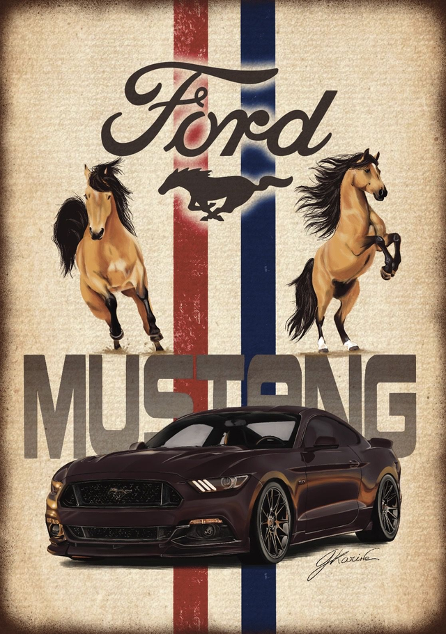 Cette illustration célèbre l’alliance entre la puissance sauvage des mustangs et l’icône automobile Ford Mustang. Deux chevaux en pleine course, dynamiques et majestueux, semblent porter la voiture vers l’infini, symbolisant liberté et audace. Les couleurs emblématiques de Ford, bleu et rouge, renforcent l’identité visuelle de cette légende.