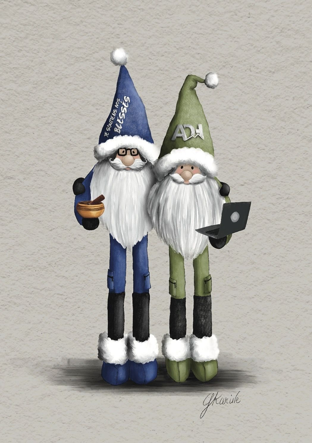 Découvrez cette illustration chaleureuse mettant en scène deux pères Noël solidaires, habillés aux couleurs de l'association ADH.
